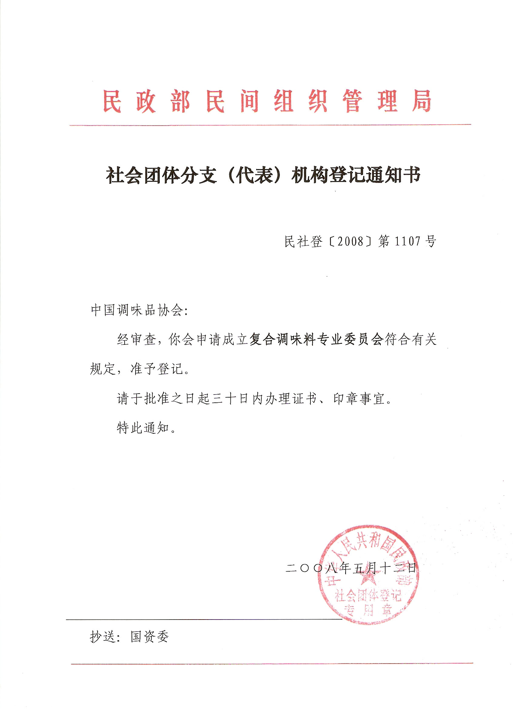 经中华人民共和国民政部(民社登[2008]第1107号文件)(见附件一)批准,小草影视(以下简称协会)复合调味料专业委员会正式成立。